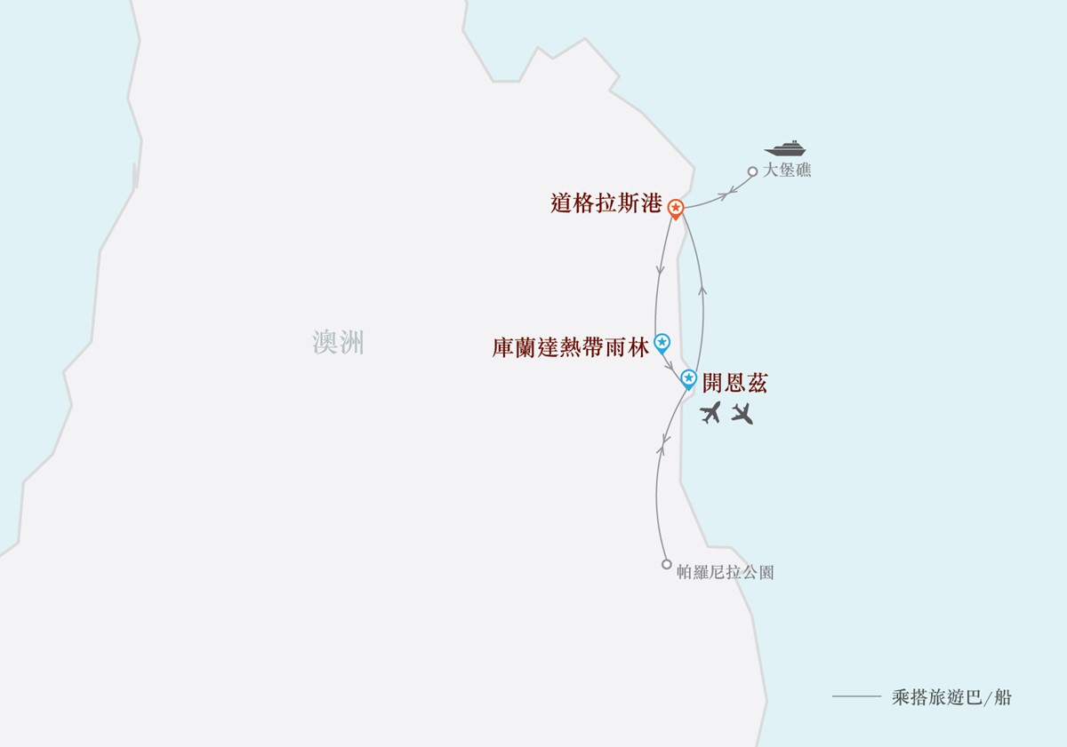 搭乘銀梭號(Quicksilver)是澳洲昆士蘭州大堡礁之最,擁有大堡礁區域三大特點:最大、最快、最豪華的高級遊船,世界級明星、各國大使、總統等重要人物都會指定乘坐的大堡礁第一遊船,可說是大堡礁的精品名牌。 道格拉斯港參觀屢獲殊榮的野生動植物棲息地,從親手餵養代表澳洲的袋鼠,到一睹傳奇的南部鴕鳥風采,締造獨一無二的難忘體驗。