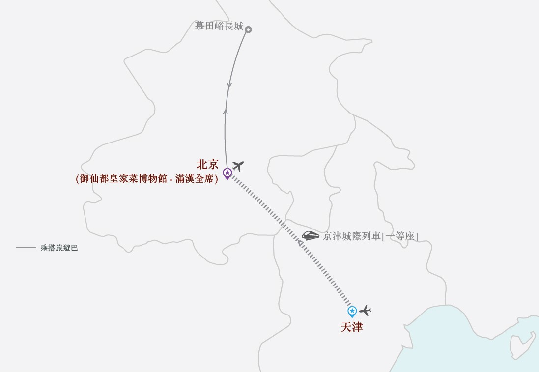 特別安排於御仙都皇家菜博物館享用滿漢全席。滿漢全席約40道菜,用餐其間主廚會逐一介紹當中菜式及上菜儀式,全程用餐時間約2.5小時。於哈馬爾罕絲路餐廳 品嘗絲路異國風情美食,大飽口福。品嘗大董烤鴨,經典粵菜於明閣Ming Court中餐廳。於聚德樓飯莊京魯菜。再於天津米其林星廚主理餐廳-岑樓·名廚享用地道菜,一流享受。更於天津耳朵眼會館品嘗清真菜,大飽口福。
