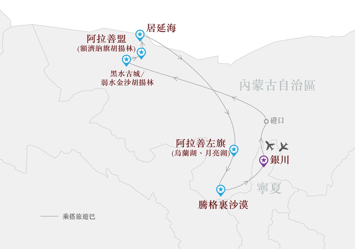 遊訪內蒙兩大絕美胡楊林:黑城弱水胡楊林景區、額濟納胡楊林景區、金秋十月碧水胡楊交相輝映,秋色如詩如畫,拍攝胡楊千姿百態;安排沙漠越野(2至3人一車)進入騰格里沙漠腹地,穿越五湖拍攝(月亮湖全景:小天鵝湖、烏蘭湖、蘇海圖湖、太陽湖、遠眺月亮湖(可拍攝月亮湖全景);夜攝胡楊,夜色為大漠披上了神秘的面紗,胡楊在浩瀚的星空下更顯嫵媚,絢麗的燈光襯托著金色的胡楊,美麗動人;拍攝居延海日出,帶出「塞外江南」的靈動之美;參觀西夏王陵遺址,這是西夏王朝的皇家陵園,埋葬了西夏王朝的多位皇帝。安排足夠時間拍攝日落王陵,醉人美麗。