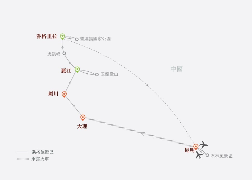 精心安排從昆明到大理,再到劍川、麗江、香格里拉,不走回頭路,讓客人慢慢適應高原環境;額外包乘鐵道列車由昆明前往大理,內陸機由香格里拉飛返昆明,節省約十多小時車程;遊覽玉龍雪山,保證乘扇子陡大索道前往海拔4506米之冰川公園,是玉龍雪山現代冰川的典型代表;欣賞世界高海拔的歌舞劇《印象麗江》表演,由著名導演張藝謀執導,融匯極致的視覺與震撼聲樂,集中展現原生態的民俗風貌。