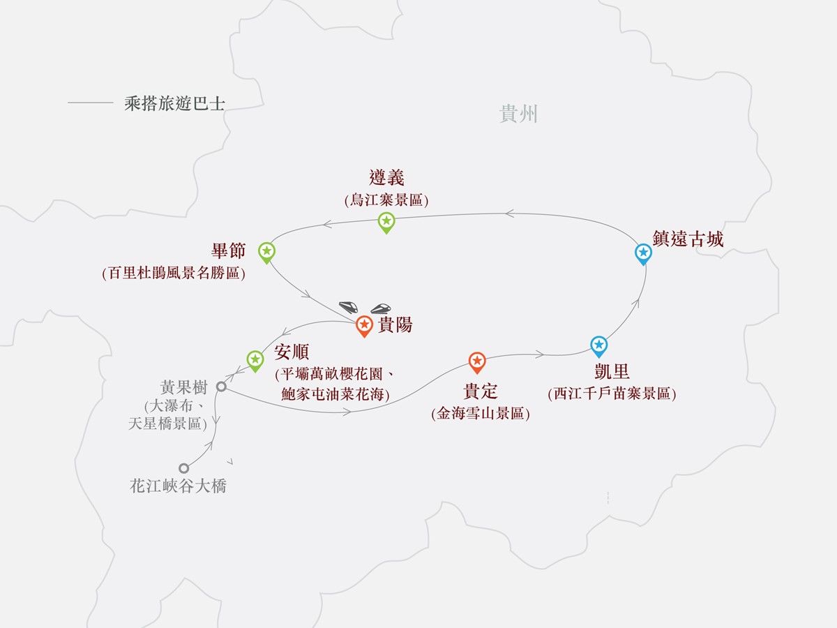 遊覽貴定金海雪山景區,欣賞萬畝油菜花和千頃的李花,構成了「金海雪山」的美麗景色; 遊逛被譽為東方威尼斯和擁有2000多年歷史的文化古城的鎮遠古城,並遊覽青龍洞古建築群,古巷道。遊覽國家5A級景區-畢節百里杜鵑風景區,這裡杜鵑花漫山遍野,斑駁絢爛; 乘電瓶車和搖櫓船暢遊被譽為「西南度假新地標」的遵義烏江寨,這裡背倚青山,臨水而居。