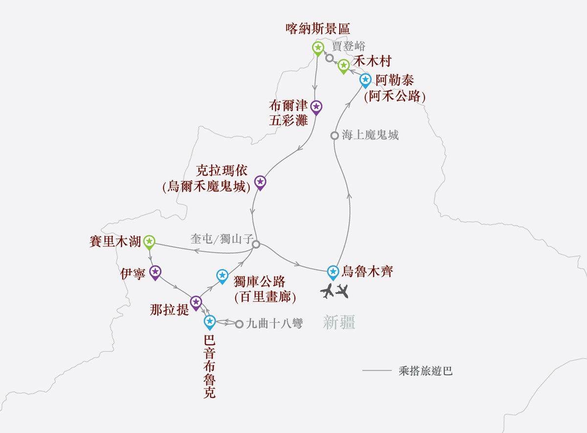 - 全程不設購物點,不設額外自費項目,讓旅遊時間更加充裕,深入探討新疆歷史文化及欣賞北疆美景。