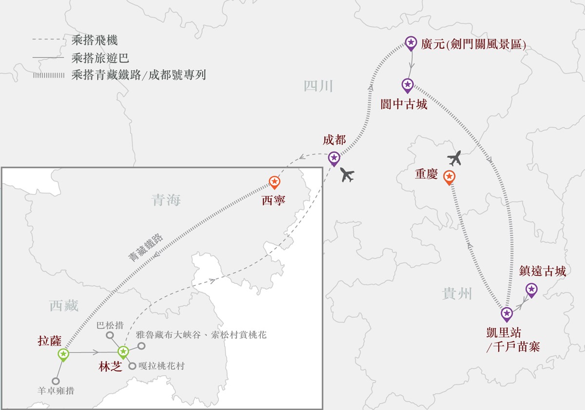 前往林芝嘎拉桃花村,參與一年一度的旅遊盛典—林芝桃花節,每逢春天桃花盛開,野生桃花林綿延百里,被稱之為林芝「桃花第一村」。「索松桃花村」位於雅魯藏布江畔的一處半山腰,每年桃花進入盛放期,吸引遊客前來觀賞及拍攝;細意安排青藏鐵路—提升至軟臥車廂(2人1廂),空間較為寬敞且提供較高的私密性,舒適自在。遊覽中國四大古城之一的閬中古城,它是國家5A級旅遊景區。