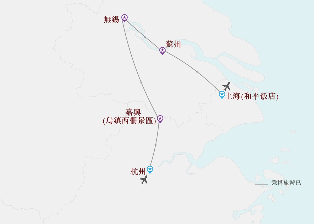 保證入住兩晚黃浦江外灘地標建築-上海國際5星品牌和平飯店。保證入住杭州國際5星Conrad Hangzhou。保證入住2023年開業的烏鎮景區內堤上酒店(Dishang Resort Hotel),地處緊鄰京杭大運河,坐享西柵古鎮與運河美景。保證入住無錫國際5星Wuxi Marriott Hotel Lihu Lake,並提升湖景房,一流享受。