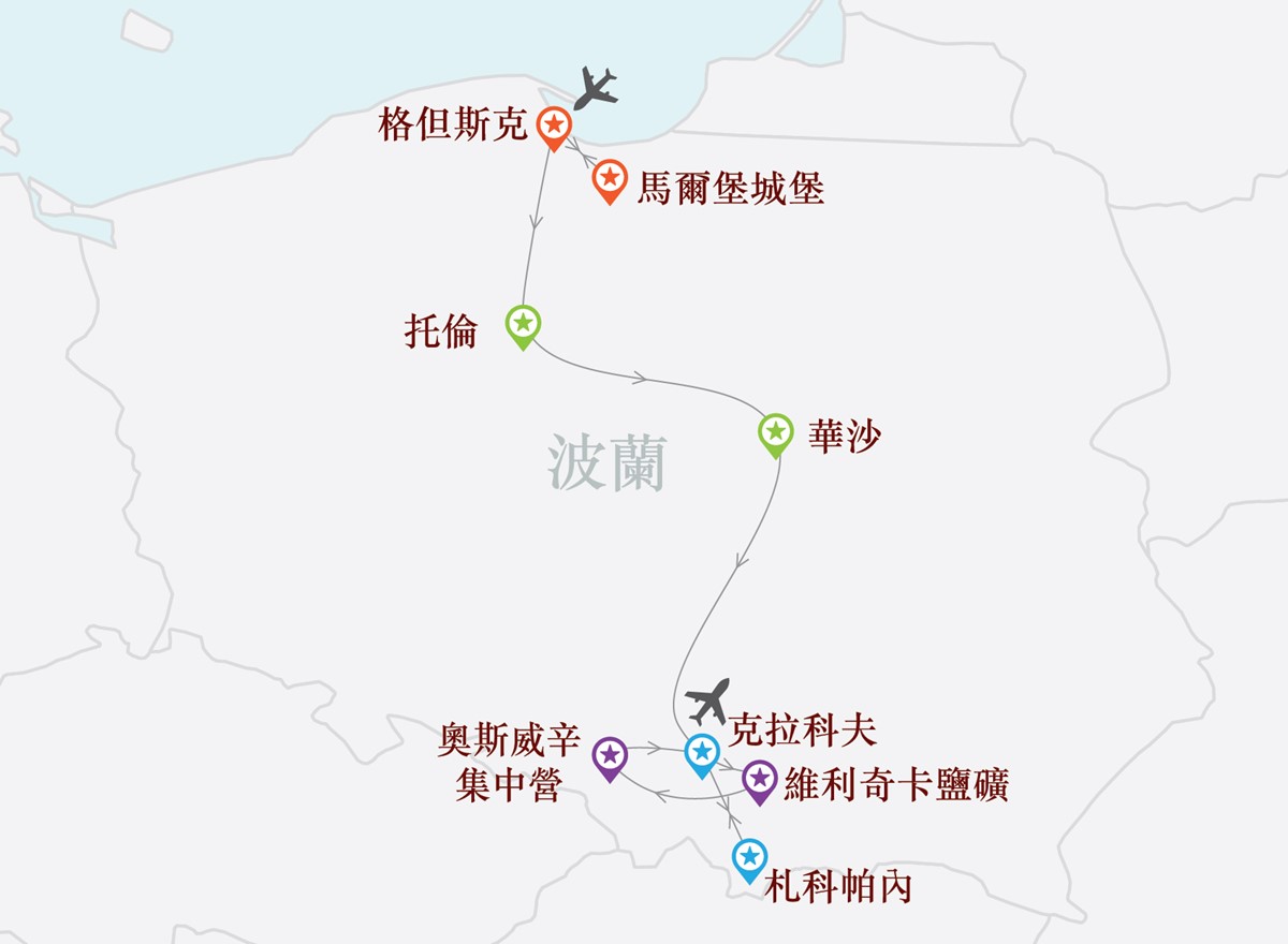 安排遊覽多個世界文化遺產:克拉科夫舊城區、維利奇卡鹽礦、奧斯威辛集中營、華沙古城、馬爾堡城堡、托倫舊城區