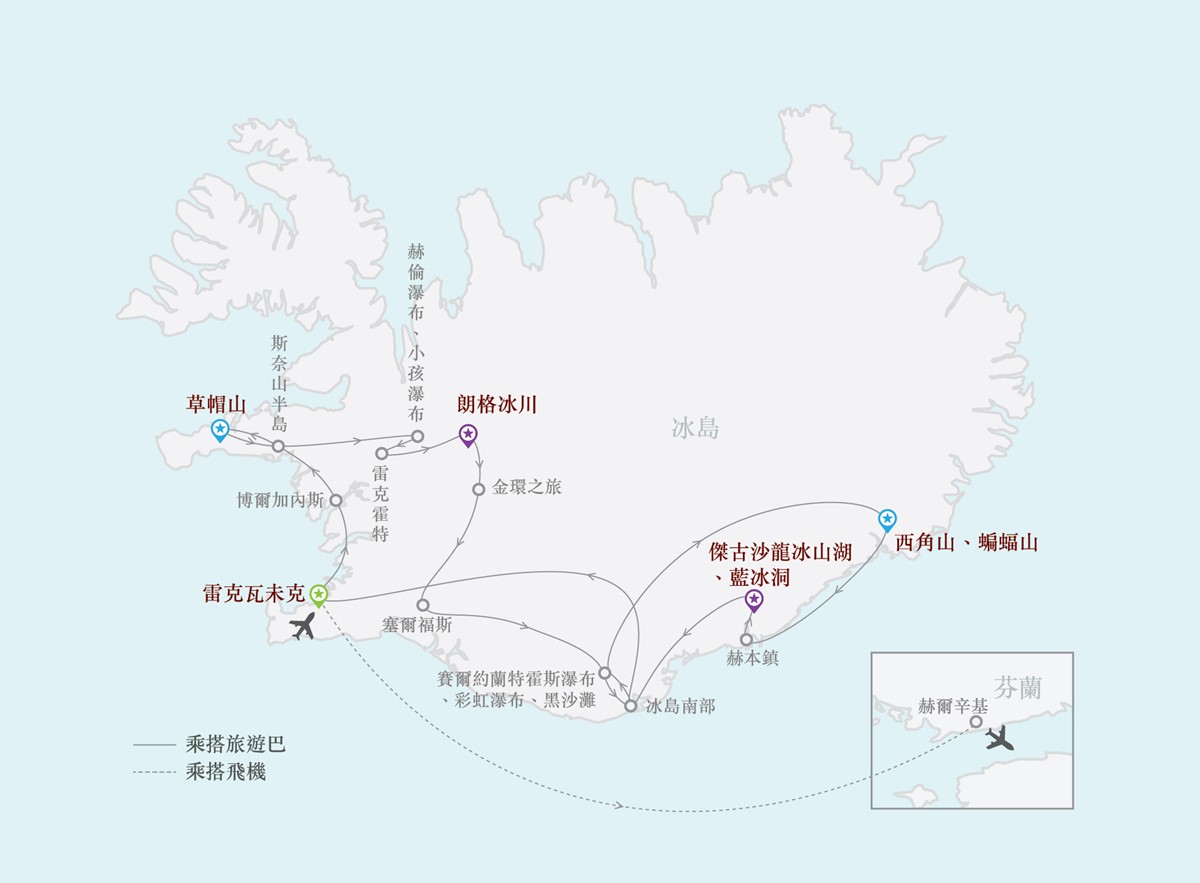 - 到訪全世界最大的人造冰川隧道,及冬季限定的瓦特納冰川藍冰洞。