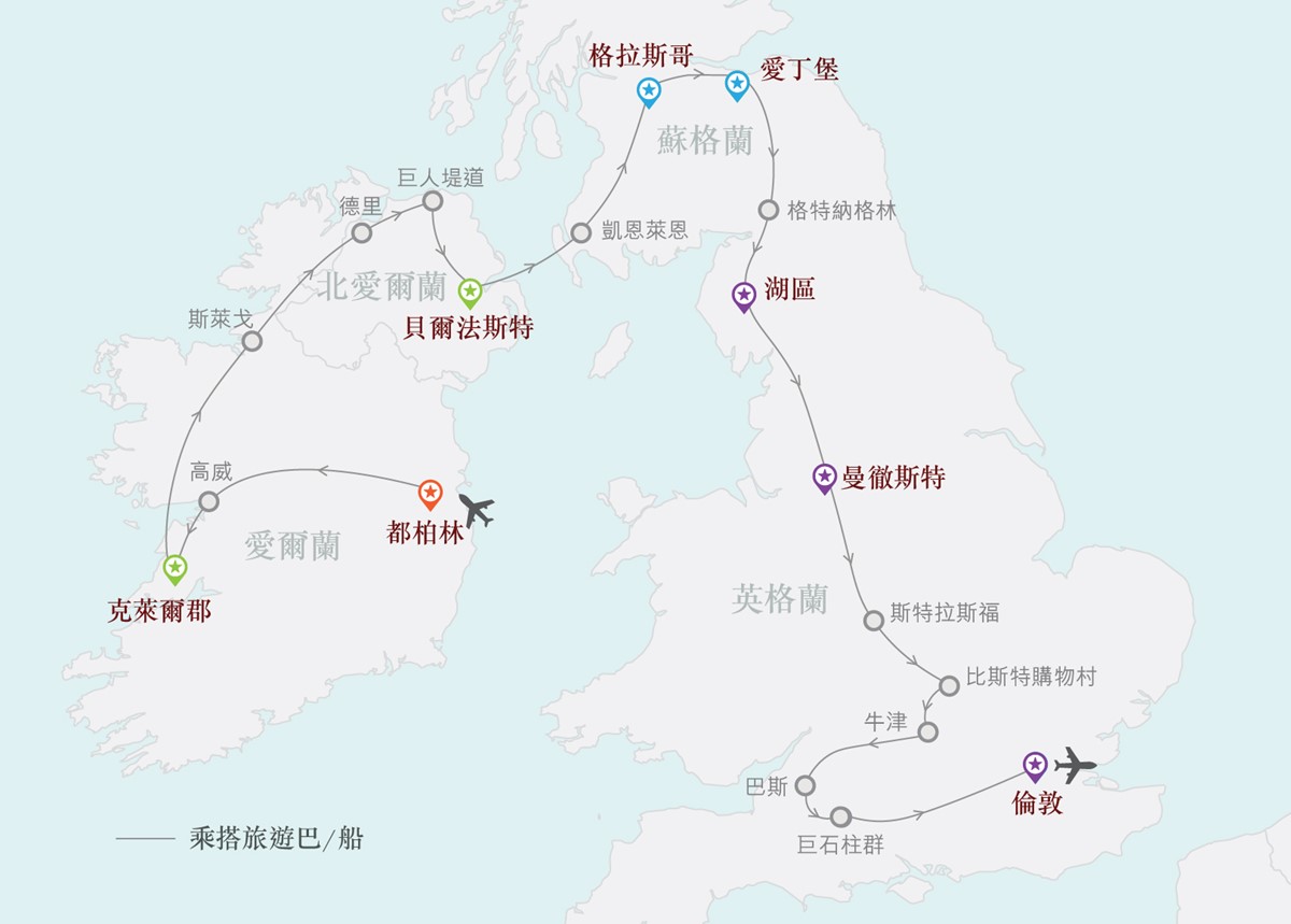 探訪聖伯多祿大教堂,愛爾蘭最具標誌性的宗教建築,建於1191年,以其哥特式建築與彩色玻璃窗聞名,感受愛爾蘭宗教與文化的象徵;參觀健力士啤酒展館了解釀酒歷史,品嚐正宗黑啤酒;登臨歐洲最高懸崖—莫赫懸崖,飽覽壯麗景色及一睹冰河時期冰川侵蝕形成的布爾本山;暢遊布爾本山,一座平頂山,屬於達特里山脈的一部分,海拔526米。1943年12月9日,一架美國陸軍航空軍B-17轟炸機在布爾本山附近墜毀,至今仍能在山坡上看到飛機的一部分殘骸;遊覽倫敦德里城,是歐洲少數城牆未被攻破過的城市之一。北愛爾蘭現存最大的受國家保護的古代遺跡,也是所有現存古蹟中擁有最長、最完整的環形城牆;探索巨人堤道,這些石柱是數百萬年前火山爆發後,熔岩冷卻收縮的結果,狀似階梯的冷郤熔岩延伸入海,1986年被列為聯合國教科文組織世界自然遺產;參觀鐵達尼號紀念館,講述1912年鐵達尼號在處女航中撞上冰山沉沒,博物館也介紹了她的姊妹船奧林匹克號和不列顛尼克號;於蘇格蘭威士忌體驗博物館品酌不同風味的威士忌,了解其在蘇格蘭文化中的重要地位;探訪愛丁堡城堡,俯瞰全城,參觀蘇格蘭王冠寶石,感受皇室與軍事歷史的輝煌;登臨卡爾頓山,欣賞國家紀念碑與愛丁堡老城新城的絕佳景觀;乘搭溫德米爾湖遊船,欣賞湖區最大湖泊的湖光山色;體驗蒸汽火車穿越鄉村的浪漫旅程;乘搭泰晤士河遊船,欣賞倫敦眼、倫敦塔等地標,感受倫敦的歷史與現代氣息;參觀倫敦自然史博物館,收藏了生物和地球科學標本約七千萬件,包括五個主題:植物學、昆蟲學、礦物學、古生物學和動物學等自然歷史。