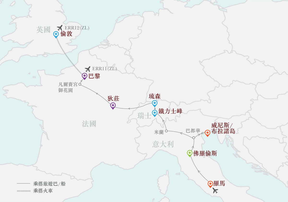暢遊羅馬、威尼斯(感受面具節狂歡)、童話布拉諾島、鐵力士峰(360°旋轉纜車、歐洲最高吊橋)、琉森、凡爾賽宮(太陽神噴泉)、巴黎(塞納河遊船)及倫敦(經典旅遊景點)。深度體驗文藝復興藝術與建築,感受歐洲古今文化交融之美。