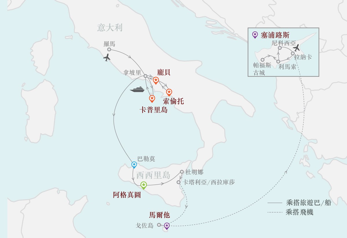 - 暢遊多個「世界文化遺產」:神殿谷、龐貝古城、阿格真圖、華雷塔、帕福斯。