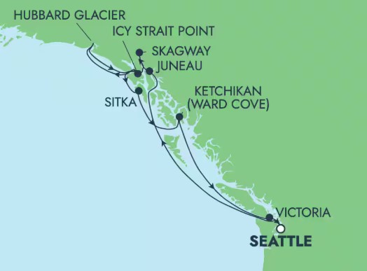 - 暢遊: 美國(西雅圖)、阿拉斯加(朱諾、史開威、巡航哈伯冰河、冰峽點(霍納)、西特嘉、凱次坎(沃德灣))、加拿大(維多利亞(卑詩省))