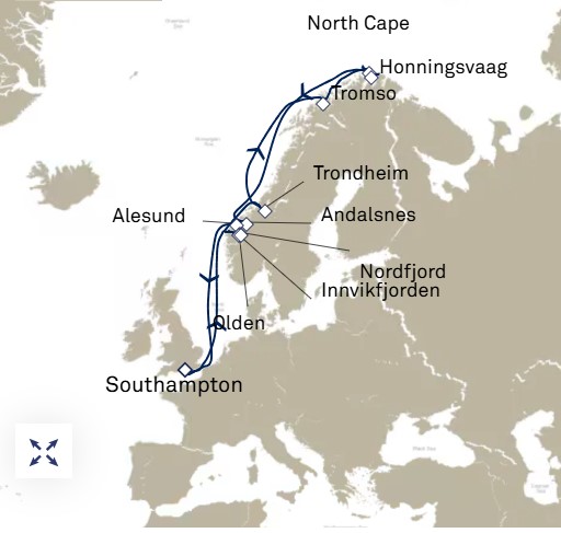 - 暢遊:英格蘭(修咸頓)、挪威(奧爾登、因維克峽灣 (景觀巡航)、諾德峽灣 (景觀巡航)、特隆赫姆、特羅姆瑟、霍寧斯沃格、北角(景觀巡航)、翁達爾斯內斯、奧勒松)