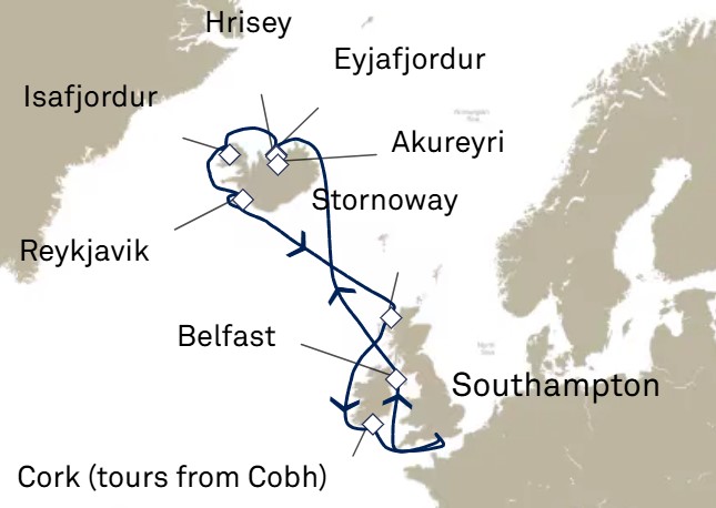 - 暢遊:英格蘭(修咸頓)、愛爾蘭(貝爾法斯特、科夫 (科克))、冰島(亞庫來利、埃亞峽灣 / 冰島 (景觀巡航)、赫里斯島 (景觀巡航)、伊薩菲厄澤、雷克雅維克)、蘇格蘭(斯托諾韋 / 外赫布里底群島)