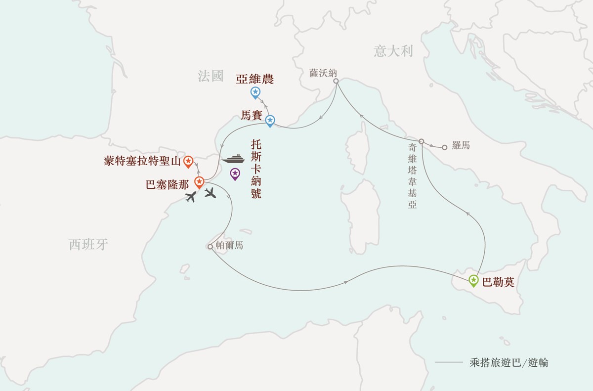 遊覽意大利的古城、西班牙的美麗壯觀的「蒙特塞拉特聖山」,及至高迪代表作神聖家族教堂及葵爾公園,一窺高迪在建築藝術上劃時代的驚世才華。及到訪遊覽法國第二大城市馬賽,並參觀名勝聖母院,及前往有「教皇城」之稱的亞維農。