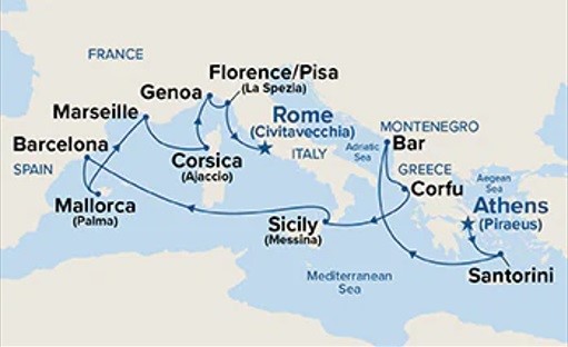- 暢遊: 希臘(雅典(比雷埃夫斯)、聖托里尼、科孚島)、黑山共和國 (巴爾)、意大利(西西里(墨西拿)、熱拿亞(五漁村)、拉斯佩齊亞 (佛羅倫斯/比薩)、奇維塔韋基亞(羅馬))、西班牙(巴塞隆拿、馬略卡(帕爾馬))、法國(馬賽(普羅旺斯)、科西嘉島(阿雅克肖))
