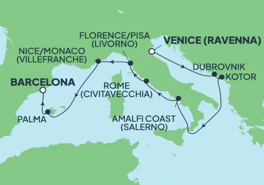 - 暢遊: 意大利(威尼斯(拉溫那)、阿馬爾菲海岸(薩勒諾)、奇維塔韋基亞(羅馬)、利禾奴(佛羅倫斯/比薩))、克羅地亞(杜布羅夫尼克)、黑山共和國(科托)、法國(尼斯/摩納哥(濱海自由城))、西班牙(帕爾馬(馬略卡島)、巴塞隆拿)
