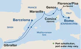 - 暢遊: 西班牙(巴塞隆拿)、直布羅陀、法國(馬賽(普羅旺斯))、意大利(熱拿亞(五漁村)、拉斯佩齊亞(佛羅倫斯/比薩)、奇維塔韋基亞(羅馬))