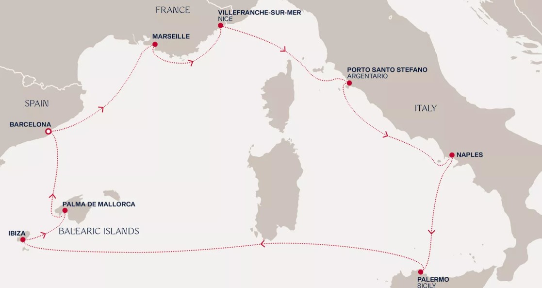 - 暢遊: 西班牙(巴塞隆拿、伊比薩、帕爾馬馬咯卡島)、法國(馬賽、濱海自由城(尼斯))、意大利(聖托斯特凡諾港(蒙泰阿真塔里奧)、拿坡里、巴勒莫(西西里島))