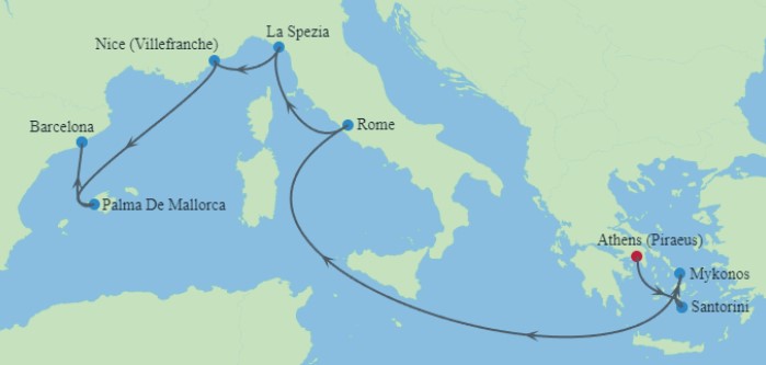 - 暢遊:希臘(雅典 (比雷埃夫斯)、聖托里尼、米科諾斯島)、意大利(羅馬 (奇維塔韋基亞)、佛羅倫斯 / 比薩 (拉斯佩齊亞)、法國(尼斯 (濱海自由城))、西班牙(帕爾馬、巴塞羅拿)