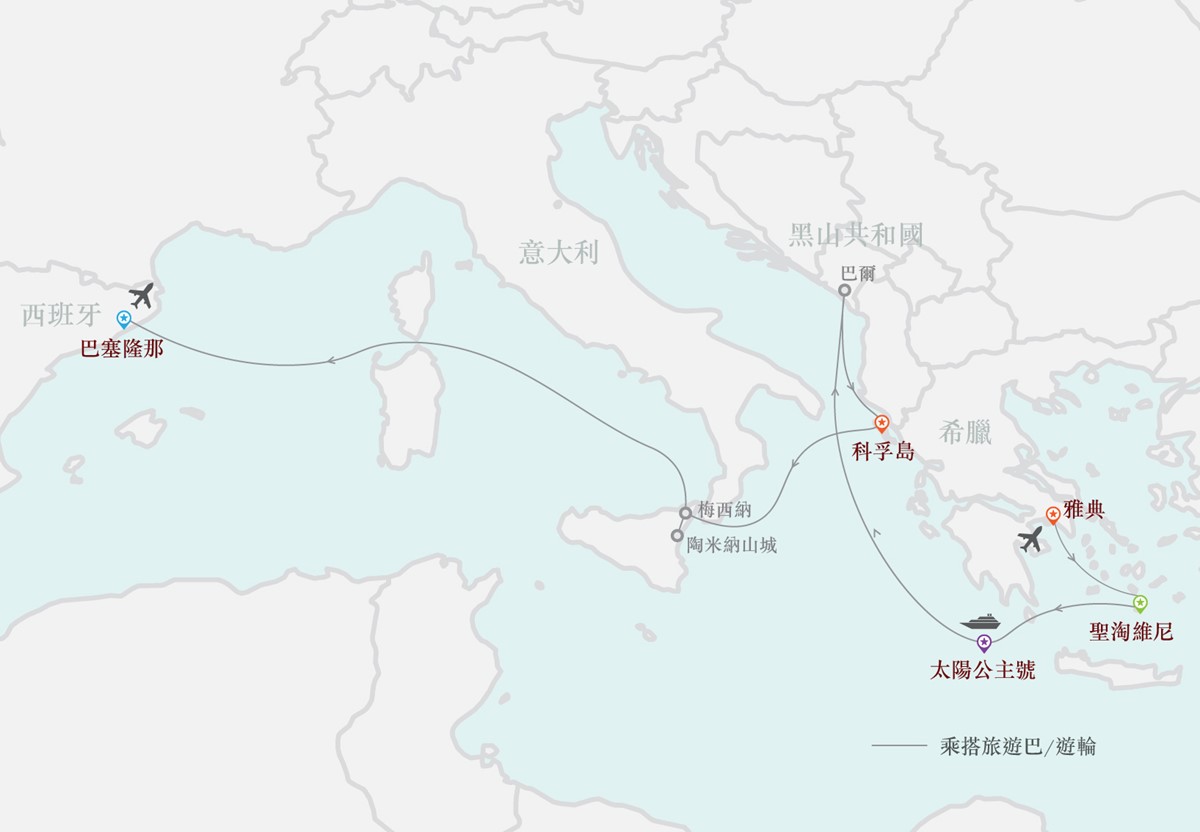 乘全新太陽公主號遊輪,暢遊希臘雅典衛城、聖淘維尼白屋島、科孚綠寶石島、黑山巴杜華及科托爾古城、意大利陶米納山城、西班牙巴塞隆那聖家堂及蒙特塞拉特聖山。岸上觀光豐富,UNESCO遺址盡覽,專業領隊全程服務。