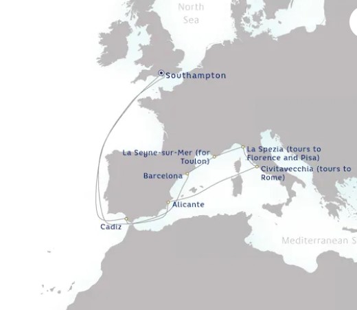 - 暢遊: 英國(修咸頓)、西班牙(加的斯 (塞維爾) 、巴塞隆拿、阿利坎特)、法國(濱海拉塞訥 (土倫))、意大利(拉斯佩齊亞(佛羅倫斯/比薩)、奇維塔韋基亞 (羅馬))