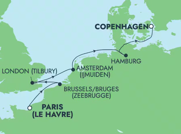 - 暢遊: 法國(勒阿弗爾(巴黎))、比利時(澤布呂赫(布魯塞爾/布魯日))、英格蘭(提伯利(倫敦))、荷蘭(阿姆斯特丹(艾默伊登))、德國(漢堡)、丹麥(哥本哈根)