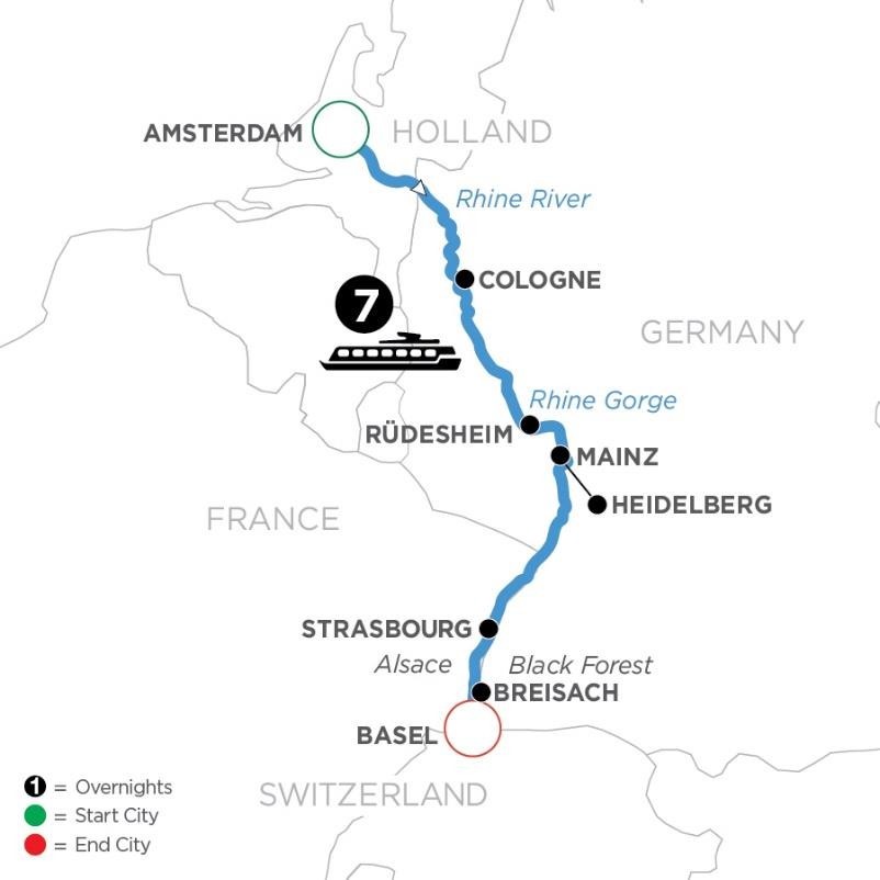 - 暢遊: 荷蘭(阿姆斯特丹)、德國(科隆、萊茵河峽谷、呂德斯海姆、美因茨(遊覽海德堡)、布萊薩赫(黑森林之旅))、法國(史特拉斯堡)、瑞士(巴塞爾)