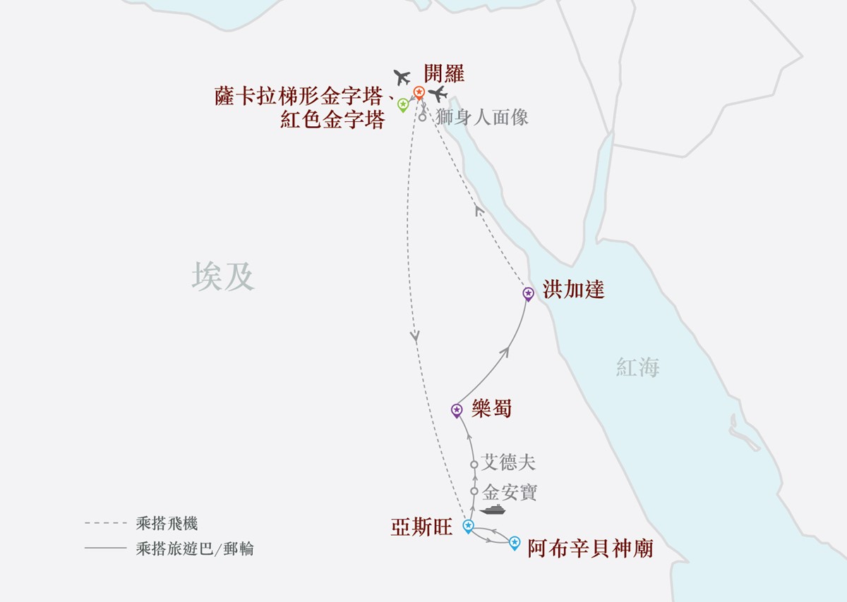 - 凌晨出發,即日抵達開羅,安排雙程內陸航機由開羅飛往亞斯旺/樂蜀及洪加達飛返開羅,省時舒適。