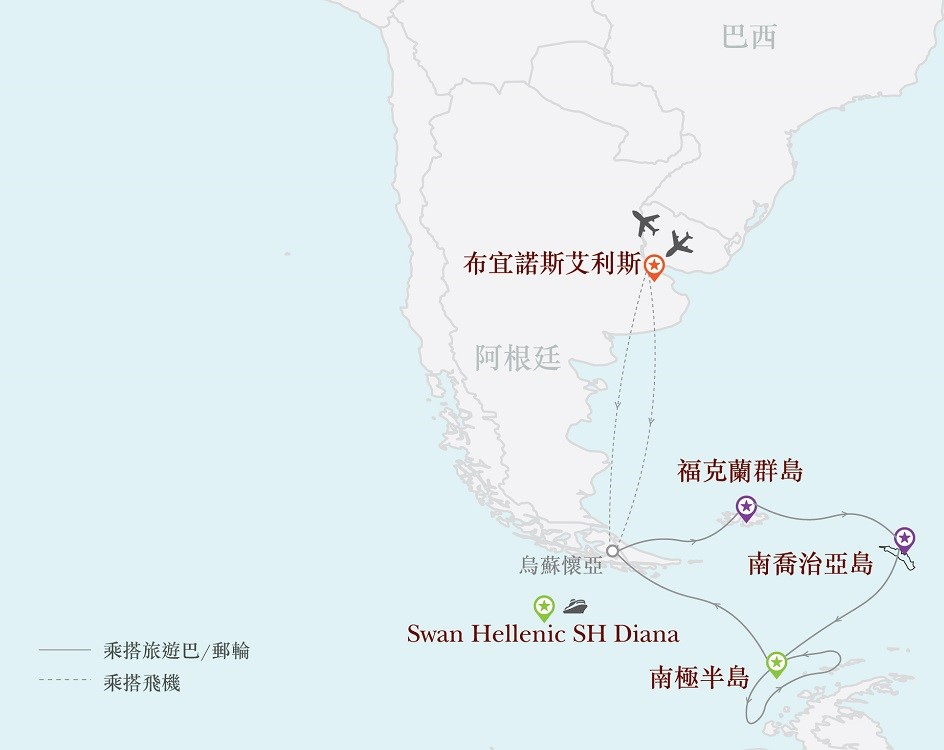 乘天鵝探索郵輪走進世界盡頭,一次帶您探索南極三島─福克蘭群島、 南喬治亞島、南極半島,與多種企鵝、海豹和鯨魚相遇,享受美不勝收的雪景,令您大開眼界。